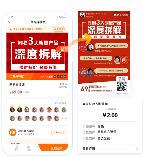 生成个人分销海报,转发朋友圈,好友购买,即可在微信支付收到分佣入账 分佣微信支付实时到账,更加刺激好玩 支持二级分佣,重复调动粉丝推广激情 无需公众号一分钟即可配置活动