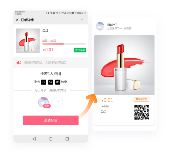 购买后发起拼团,邀请好友参与,达到指定人数即可拼团成功 付款模式多样,即可拼团购买可以原价购买 后台可设置多种拼团模式:凑团模式、虚拟拼团 无需公众号一分钟即可配置活动